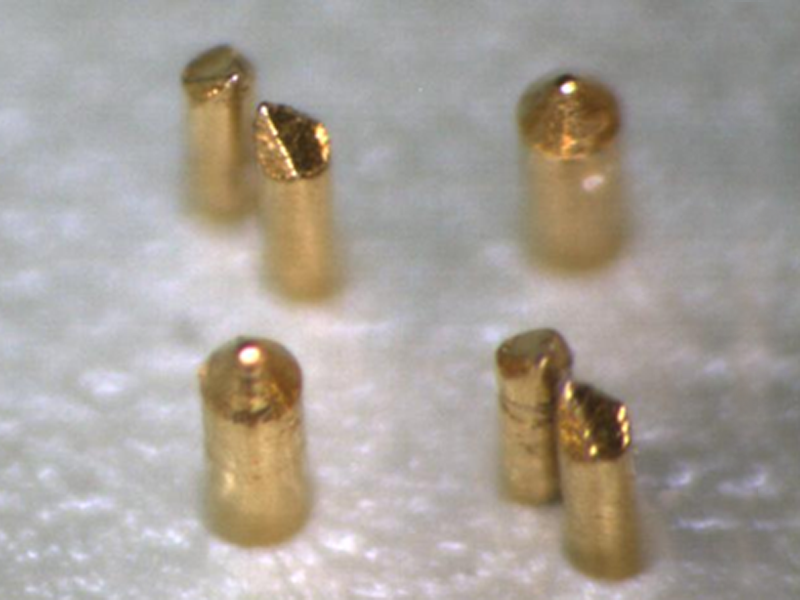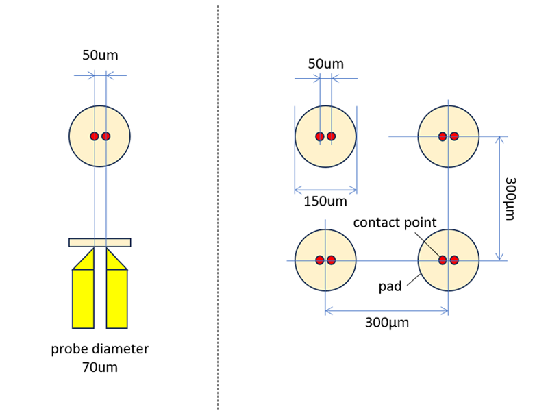 当社製品の特徴のひとつである偏芯ピンは、ピンの中心からコンタクトポイントを偏芯させることによって、四端子測定法における電流端子・電圧端子を極めて狭いピッチでコンタクトさせることが可能になる技術です*3。Φ0.07のピン径でありながら、コンタクトピッチはわずか50μmを実現しており、ピンの耐久性能・コンタクト性能を両立した独自の技術となっています。