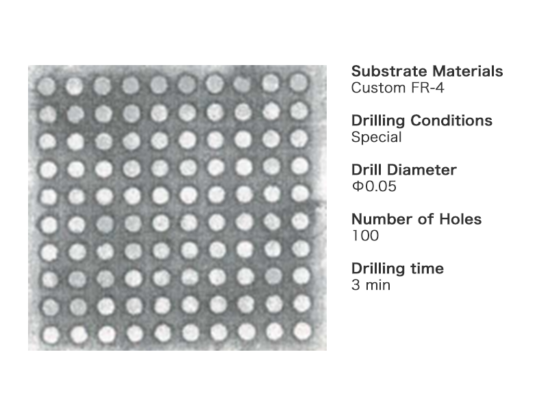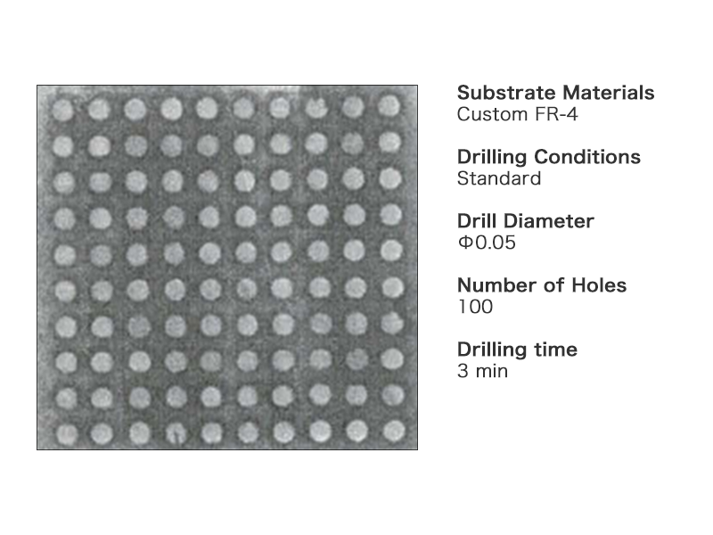 当社は、低価格でありながら加工が困難とされるFR4材料について、材料メーカーと共同で当社専用仕様のFR4を開発しました。小径ドリルを用いたNC加工評価においては、穴位置精度±5μm以下を達成しています。このNC加工条件を適用した製品加工により、安定した品質を確保しています。
